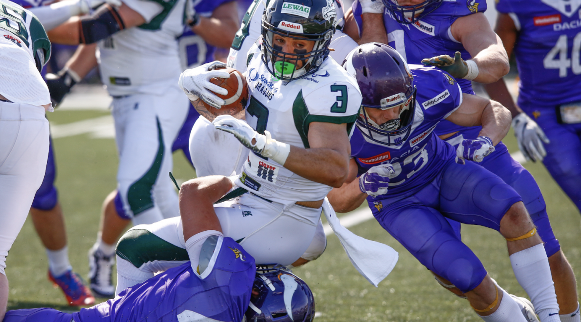 Die ersten Punkte in diesem Spiel gelangen den Vikings. Die Dragons konnten mit einem Pass von Quarterback Chad Jeffries #12 auf Receiver Philip Haun #13 zum 06:07 aufschließen. Der Druck der Hausherren auf die Offense-Line und den Dragons Quarterback war groß. Nach einer Interception im ersten Viertel, gaben durch ein Fumble, die Dragons abermals das Angriffsrecht an den Gegner ab. Die Offense der Vikings konnte noch zwei weitere Male die Endzone der Dragons erreichen (6:21) bis es dann endlich wieder den Dragons mit Philip Haun #13 gelang Punkte zu erzielen. Mit dem Punktestand von 13:21 war auch der Halbzeitstand erreicht.