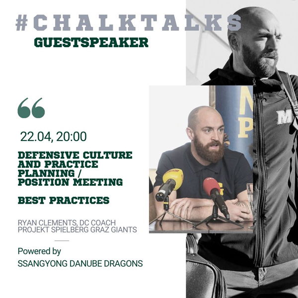 Mit Coach Ryan Clements konnten wir einen hochklassigen Gast-Vortragenden für die SsangYong Dragons Chalks Talks gewinnen. Das Thema von Coach Clements lautet: „Defensive Culture and Practice Planning/Position Meeting Best Practices“. Der Vortrag findet am Mittwoch, 22. April 2020 um 20:00 Uhr statt.