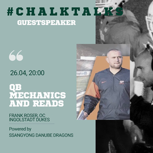 Wir freuen uns sehr einen Coach mit dieser Erfahrung für unseren Chalk gefunden zu haben. Caoch Roser, welcher selber in Deutschland, aber auch in Österreich bei den Swarco Raiders als Quarterback gespielt hat, wird über das Thema „QB Reads und Mechanics“ sprechen. Der SsangYong Chalk Talk #9 findet am Sonntag, 26. April 2020 um 20:00 Uhr statt. Wenn du dabei sein möchtest, dann melde dich jetzt per E-Mail an.